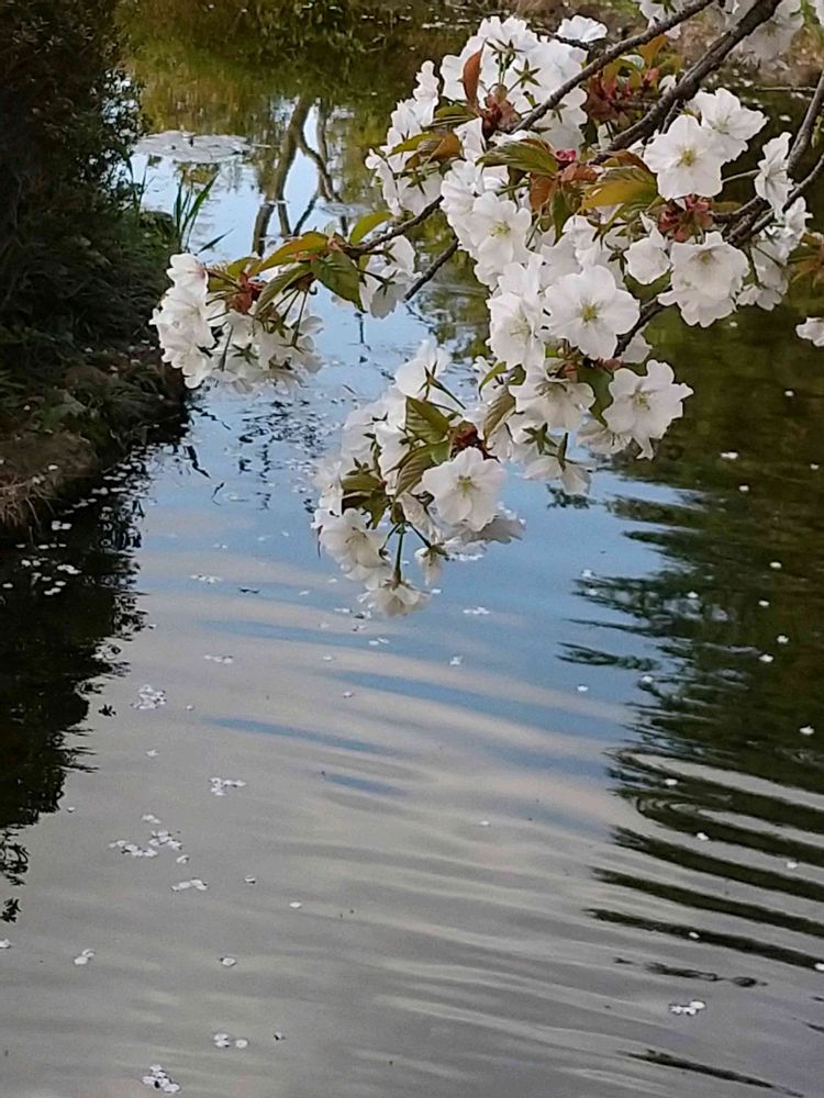 水面に映る桜🌸、花びらが水面を揺らし、波紋をおこしているような、そんな雰囲気を思わせる光景も素敵だなぁ~🎵✌️😀