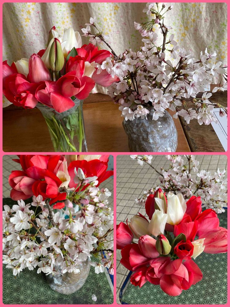 せめてお花で室内を盛り上げてみましたよ〜😆♬桜も🌸手の届くところを✂️小さな花器に生けても可愛らしいですね🌸🥰
