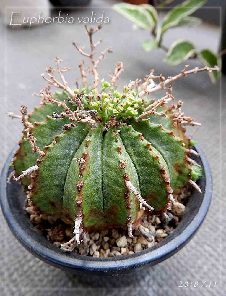 ユーフォルビア、バリダ。ただいま中心部にみっちり花を咲かせています。こっちのバリダは稜の数が多いし、棘が細くて枝分かれしている所が、先日のバリダと違います。……ちなみにバリダとメロフォルミスの区別、つきません。
