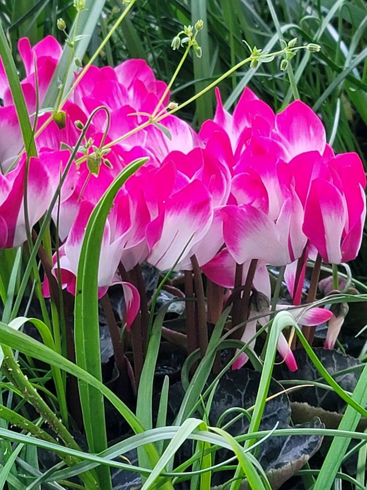 蛍光ピンクのお色がバッチリ目に痛いほど輝いておりますが✨️手前の球根たちの葉っぱとハコベ😂が柔らかくしてくれます😁💨💨