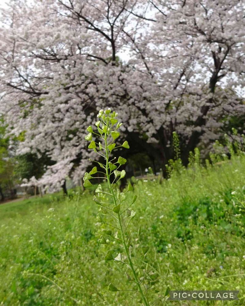 あれ昨年はここはクローバー🍀だったのにとお出かけでビックリする事って有りで😵⤵️します。同じ雑草でも楽しむ事が出来良かったです💖😂 ナズナの一輪とさくら🌸の背景春のpic素敵♪︎♪︎♡