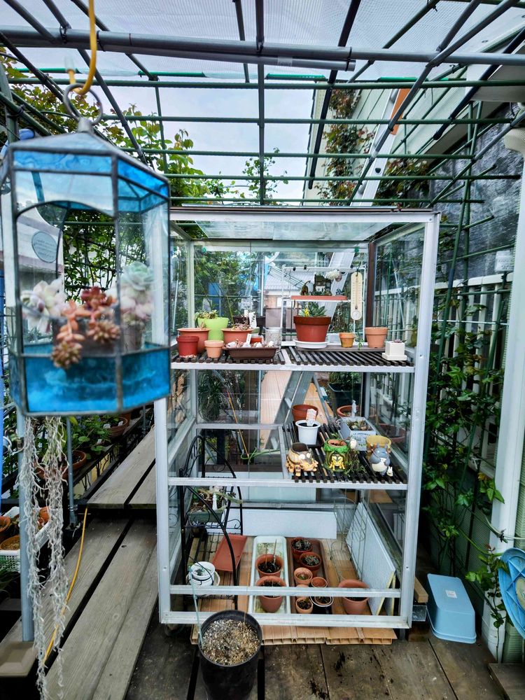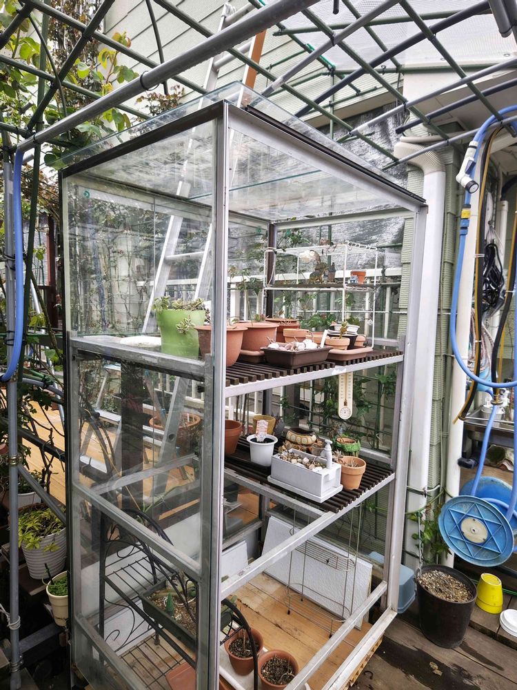 投稿写真は、東向きにした我が家のアルミ構造強化ガラス張りの温室(高さ1820mm×幅1075mm×奥行き780mm)です。82歳の大先輩が作られ、もう使わないからと言われて、譲り受けました。大先輩とは、このガーデン作りにいつも関わってくれる方です。