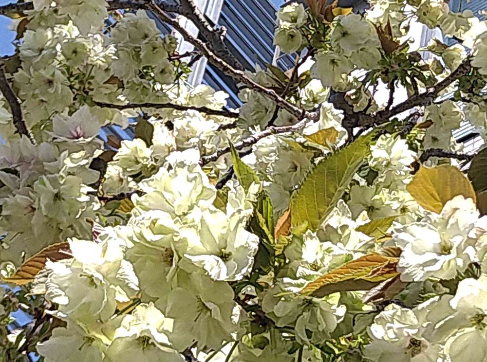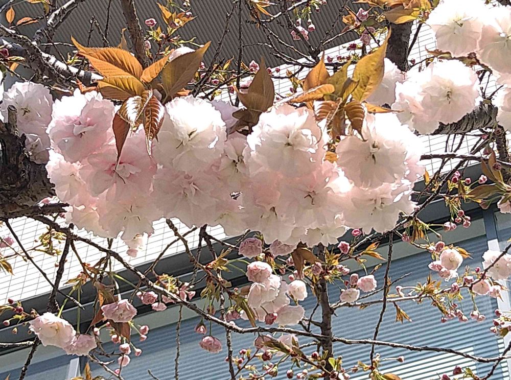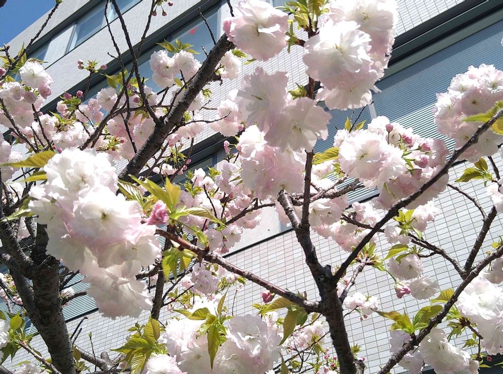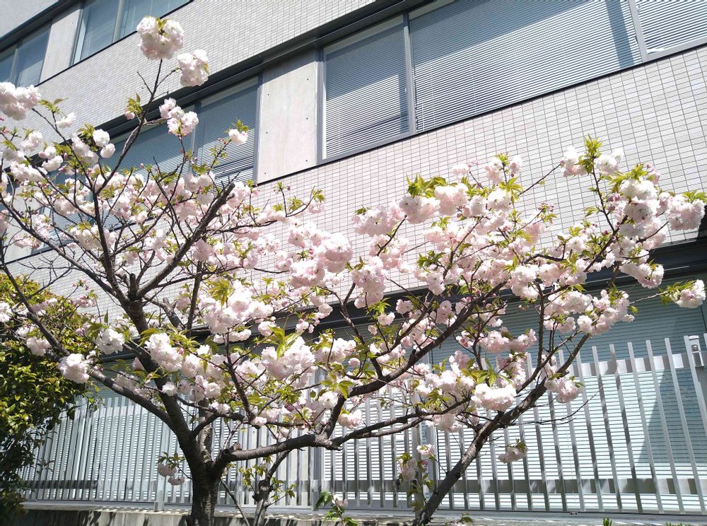 この八重桜は会社の庭園に咲いてます