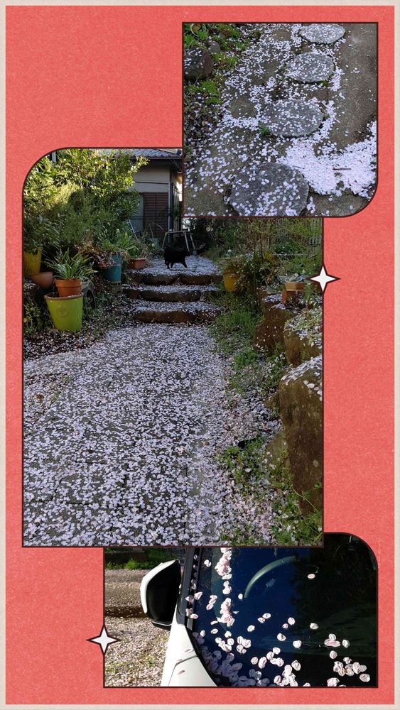 並木は近くの運動公園下の農道沿いです。私の通勤路でした。庭の絨毯は向かいの神社、庭に覆い被さる様に高く大きな木達です🌸借景が良い季節に成りました。
