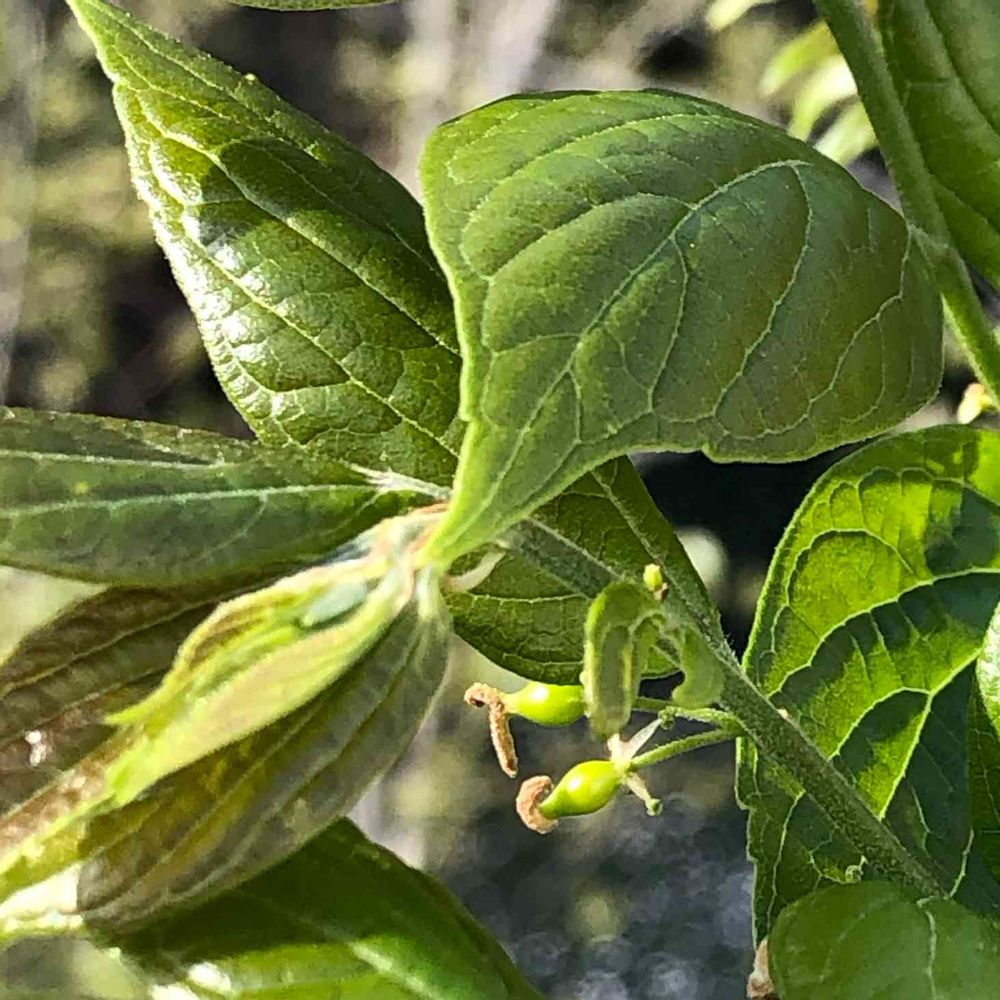 エノキの葉が芽吹いて‥よ〜く👀見てたら🌼と実が2つ