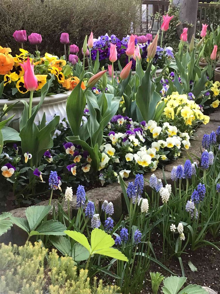 やっと 開花を 迎えて、春🌸を 謳歌する、パンジー ・ビオラ や、チューリップや ムスカリなどの 球根草花デス❣️