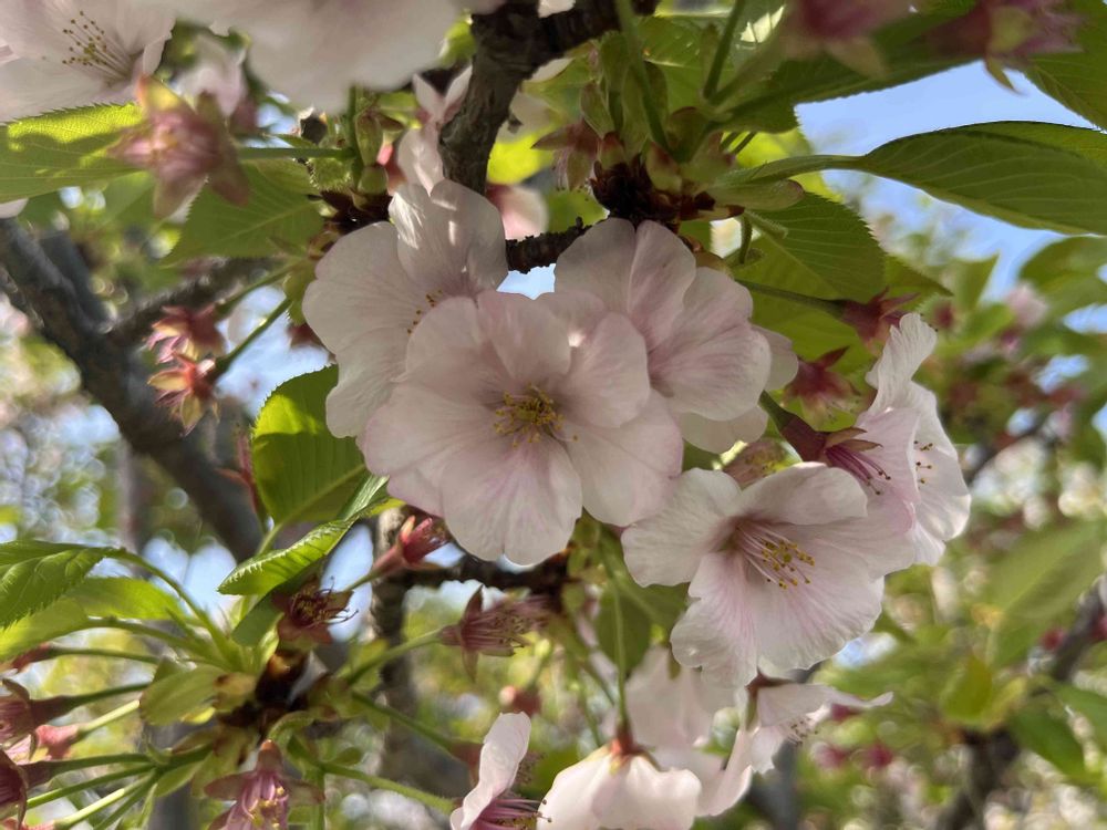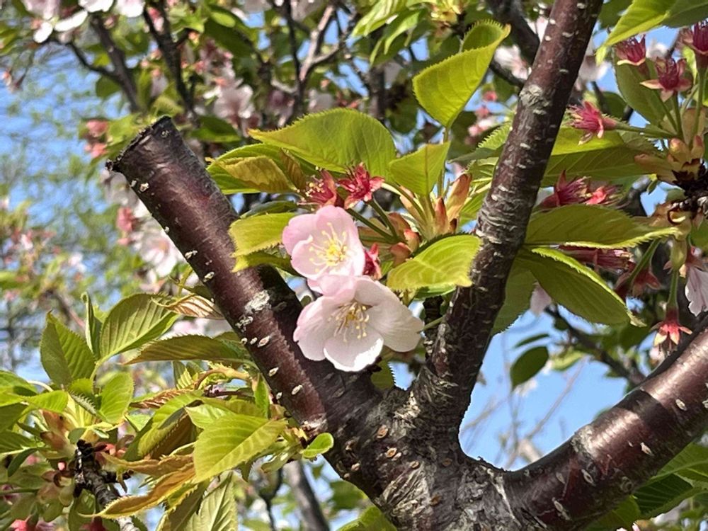 紅桜って名前だけどそれほど紅くない。葉っぱも出てるから山桜なのかな?