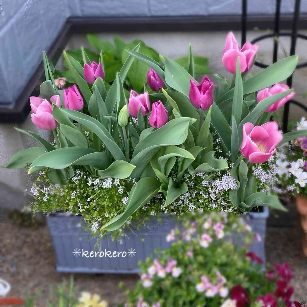 チューリップの色は濃い紫とピンク色の二色だったみたいです🙏