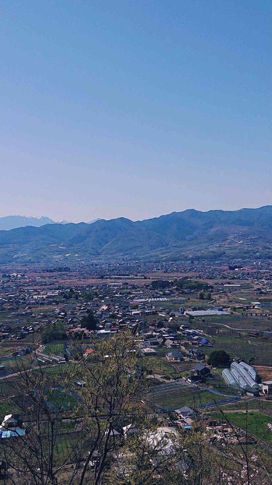 ブドウの丘からの甲府盆地に桃の花が見えるかな…