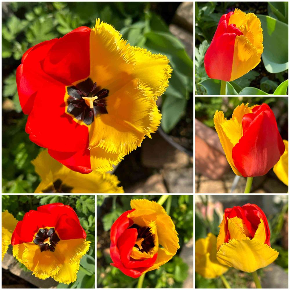 昨日に引き続き、我が家の小さな庭の小さな花壇に咲いている、わたしのビックリニュースは、花びらの色が黄色と赤色の半分こで咲いたチューリップです。