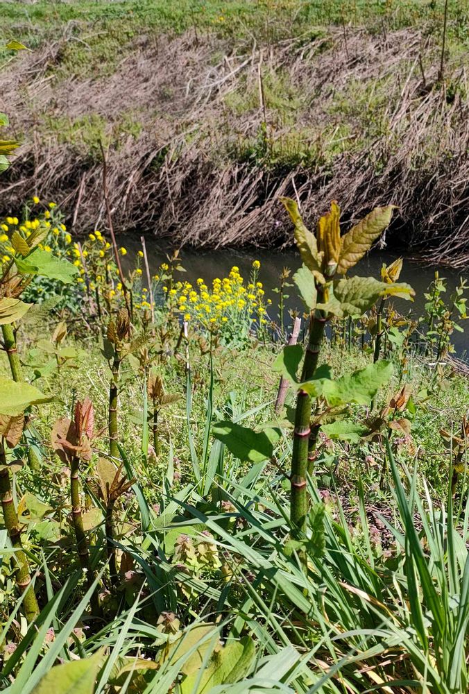 川べりの土手に食べごろのイタドリがニョキニョキと育ってきてます。水際にはナノハナが咲いてます。