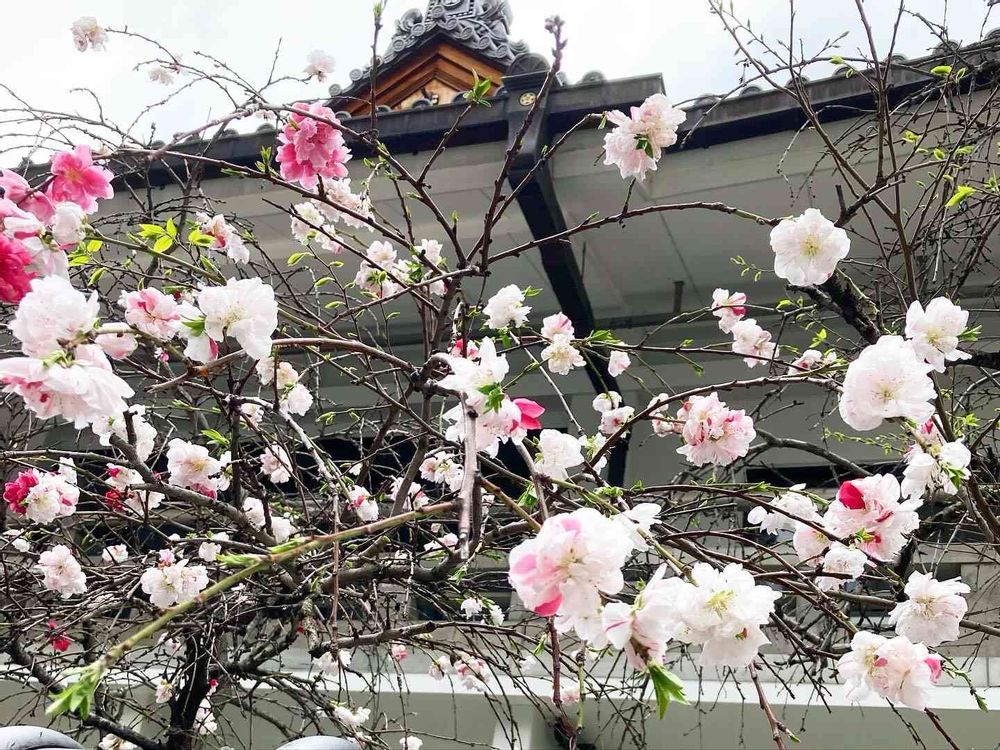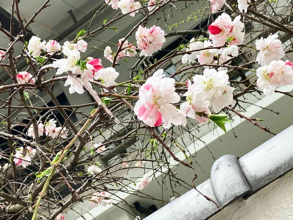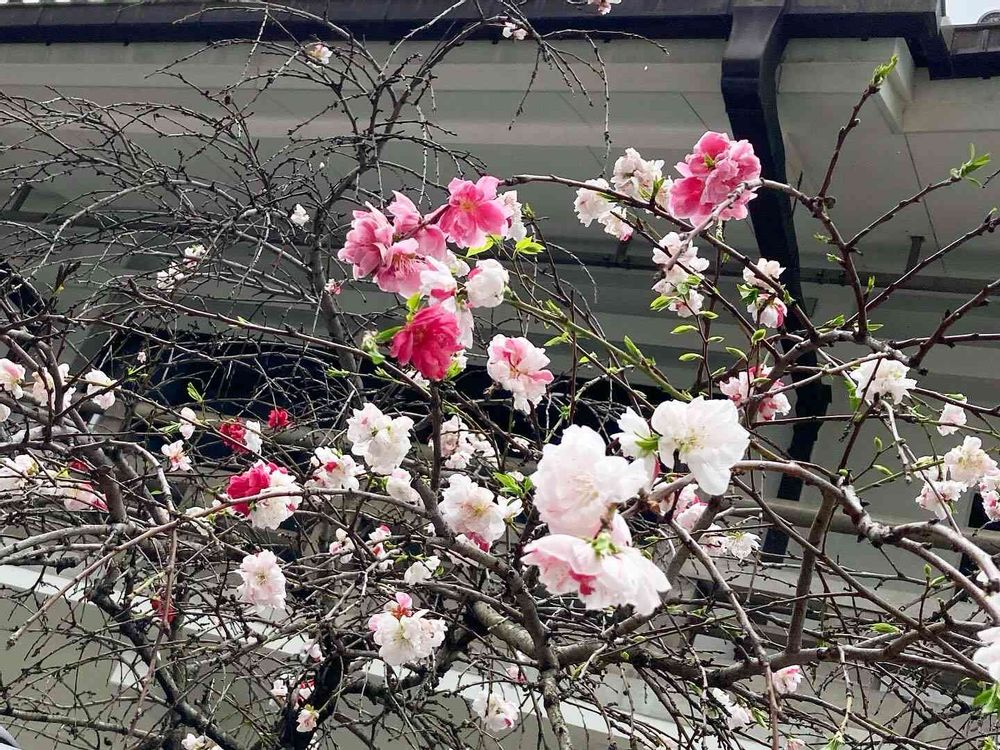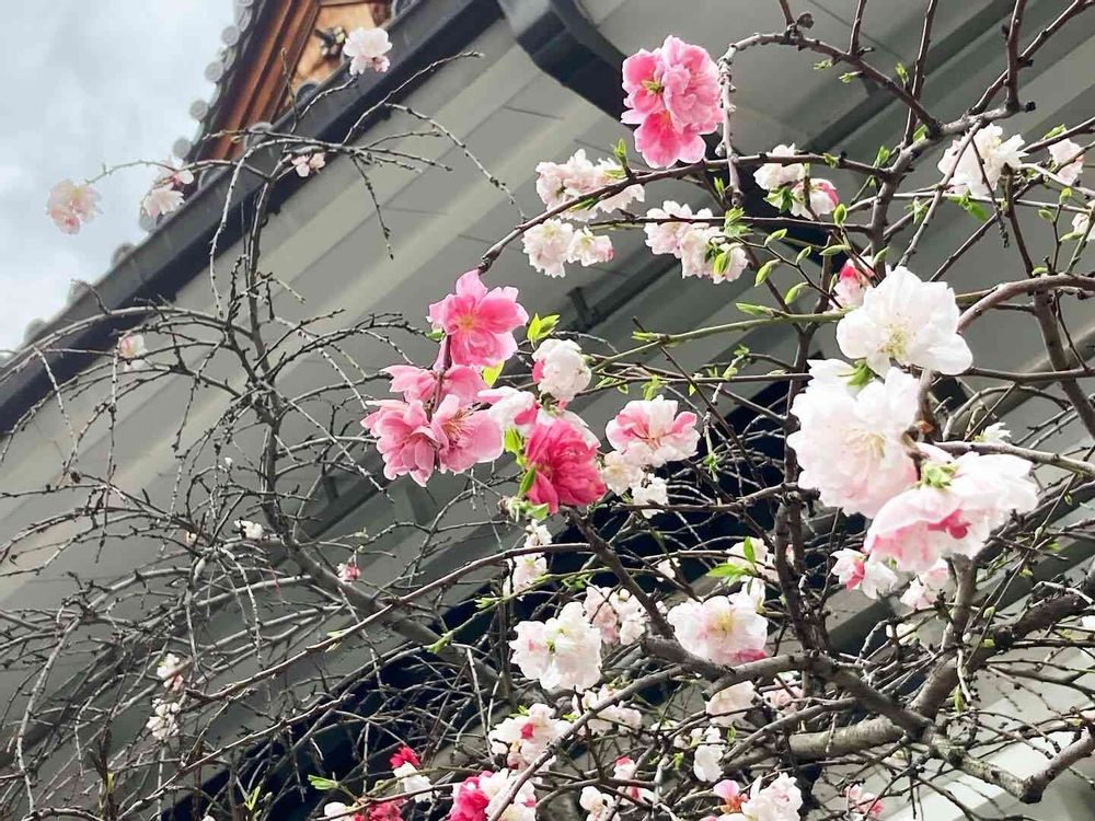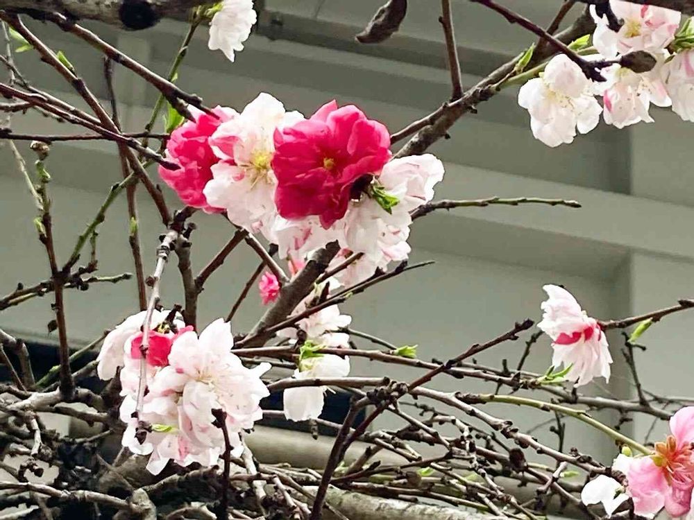 赤と白桃絞り咲き多彩な花色を咲き分ける優雅にしだれる花桃です