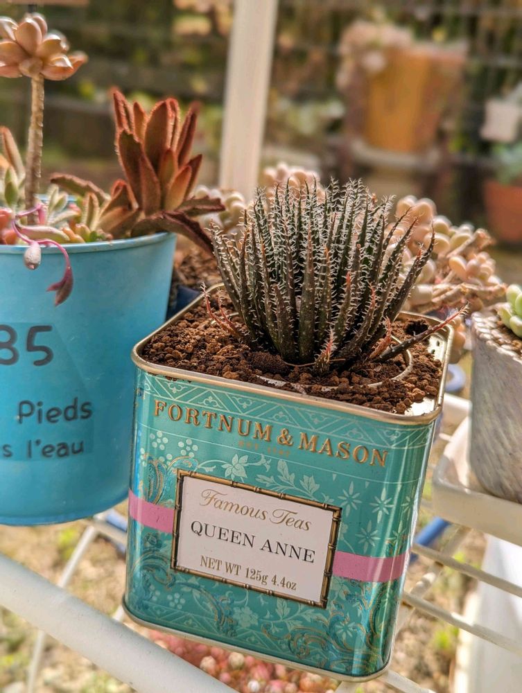 紅茶缶にふわふわのハオルチア♡