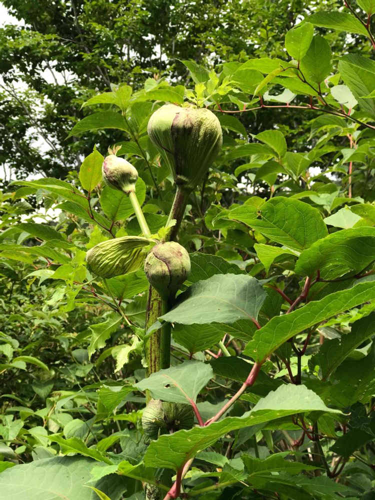 山で見かけた不思議な植物。先端の丸いのが開くと花が出てくるようです。