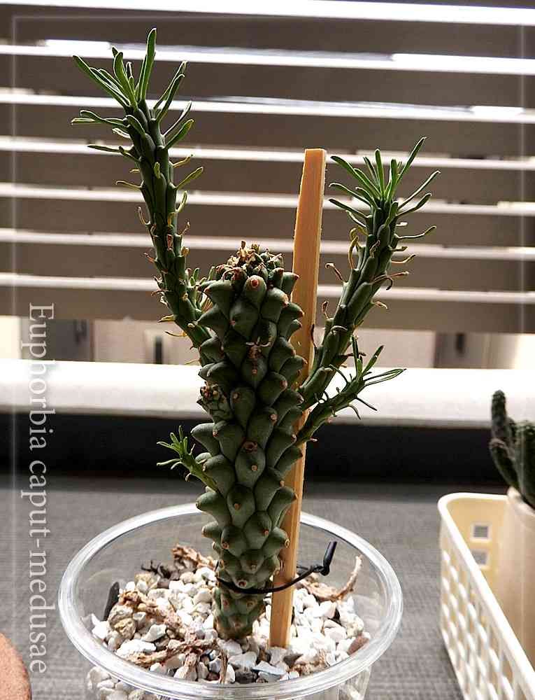 ユーフォルビア・天荒竜。植替えしたらとたんに枝をにょきにょき伸ばし始めたけど、何となく徒長気味……やっぱりやや西向きベランダでは陽射しが足りないのか?