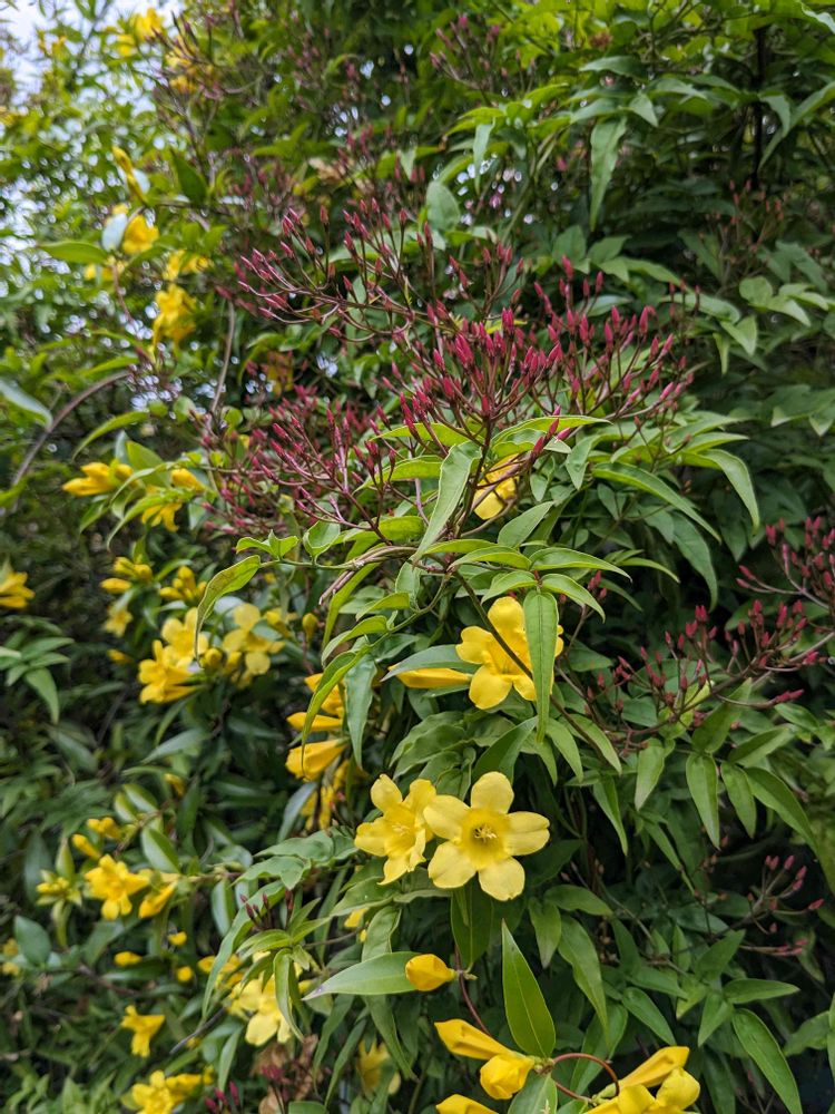 ①カロライナジャスミン②カロライナジャスミンとハゴロモジャスミンの蕾③藤