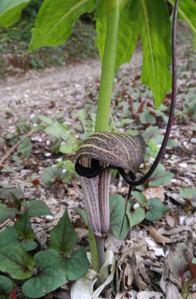 ウラシマソウは、マムシ草かなと思ったけど…花が地面に近かったのと、茎にまだら模様がなかったので…ウラシマソウかなと!🌸🌸🌿😂