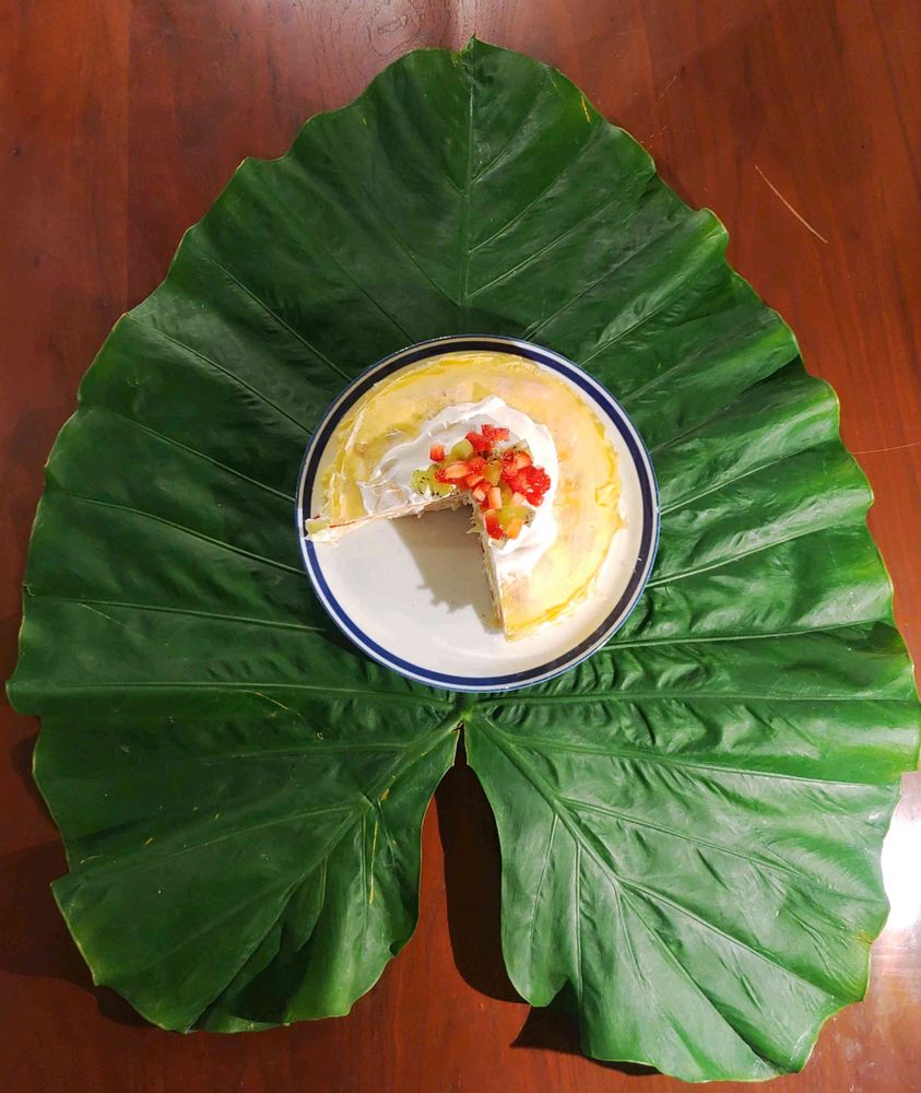 差し入れの手作りミルクレープを乗せた30センチのお皿をクワズイモの葉っぱの上に😊😊