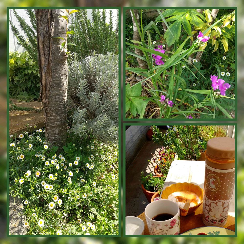 ⬅️ 3月5日投稿日には ちらほら咲いていたエリゲロン🌼が あっという間にブーケのように✨!↘️ 暖かい日差しのなかでバルコニーLunchを🐕️と共に☕️🥐🎶