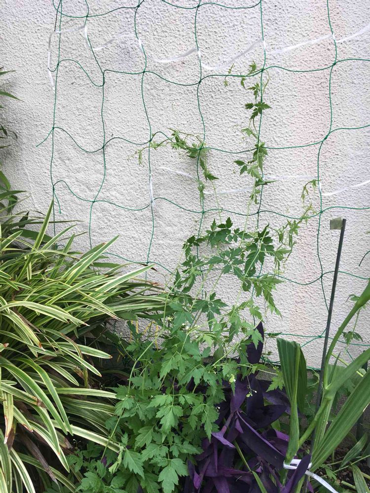 去年の零れ種からフウセンカズラ🎈がたくさん芽吹いてきたので🌱100均のネットを張ってみたけど、網目が荒すぎてイマイチ😨