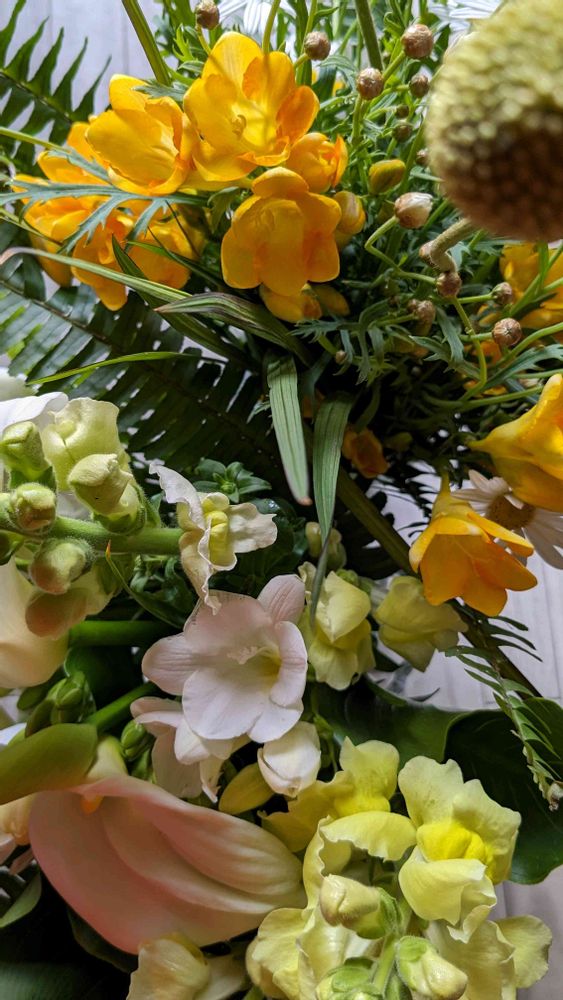 今日 朝市の花束2束 部屋の中フリージアのいい香り(*˘︶˘*).。*♡