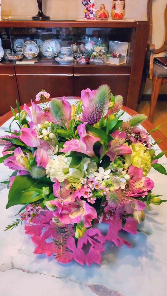 昨日はアレンジ教室の日でした。自由作品で花材からラウンドスタイルにしてみました。