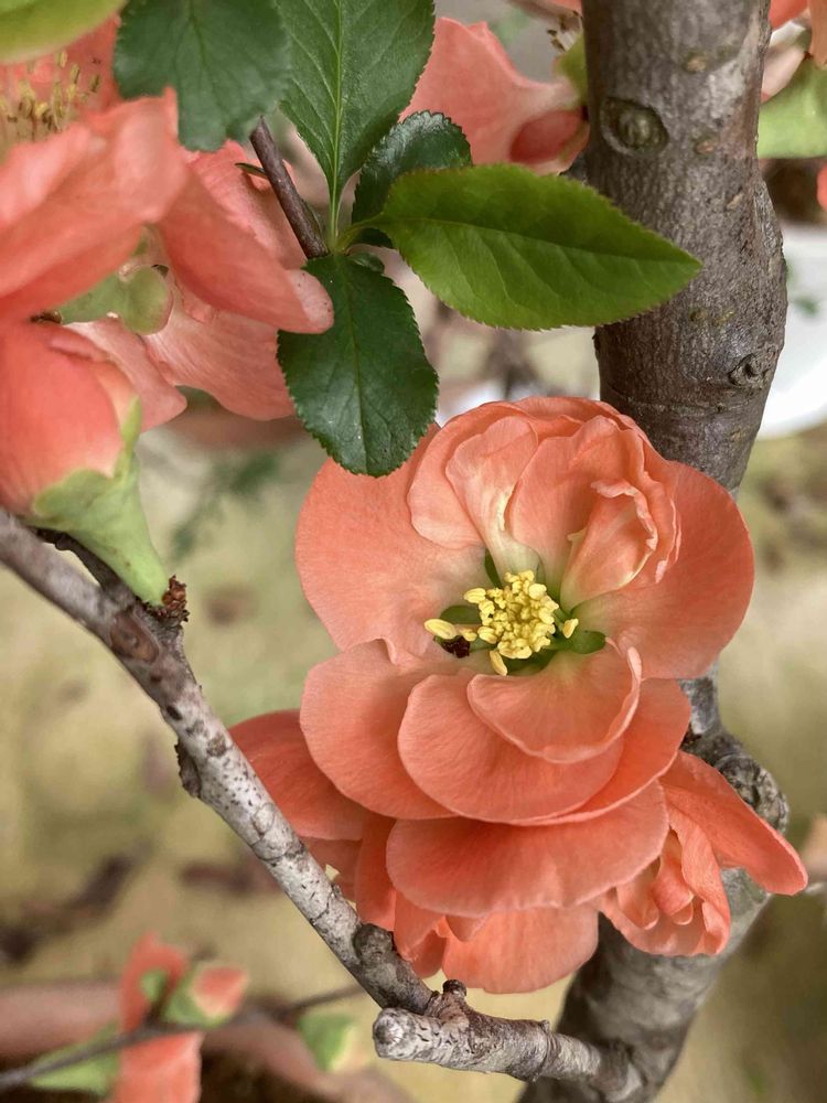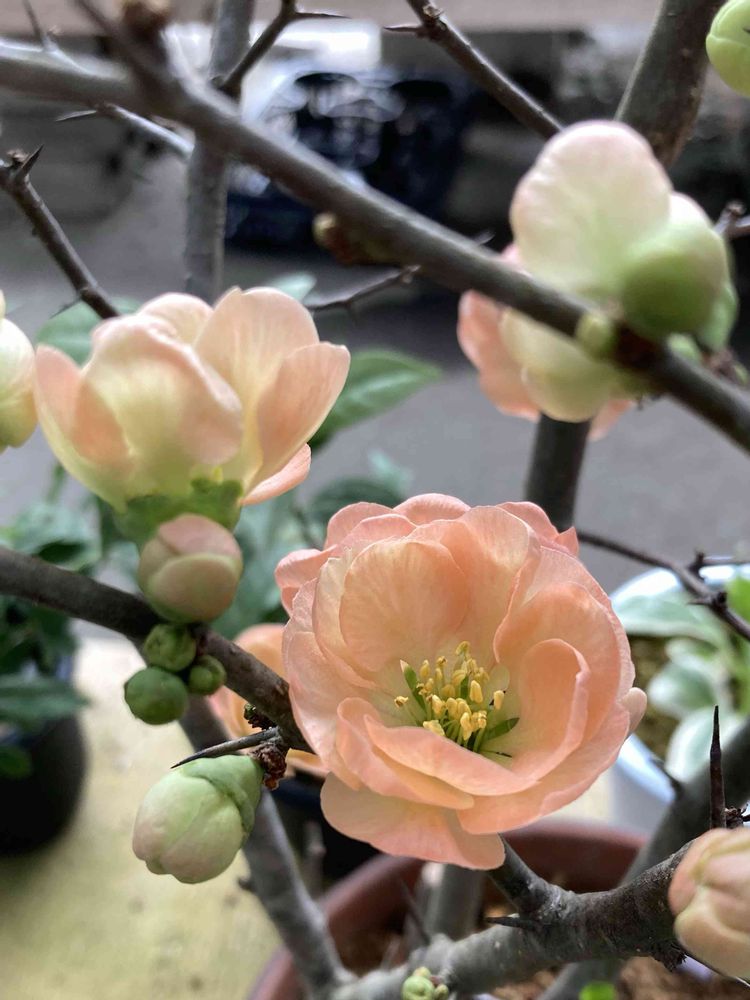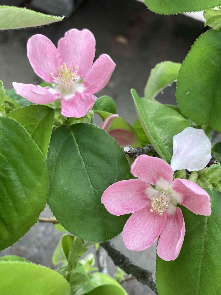 キバナイカリソウさん、ボケさん二色、カリンさん、セイヨウネズさんです🤗✨