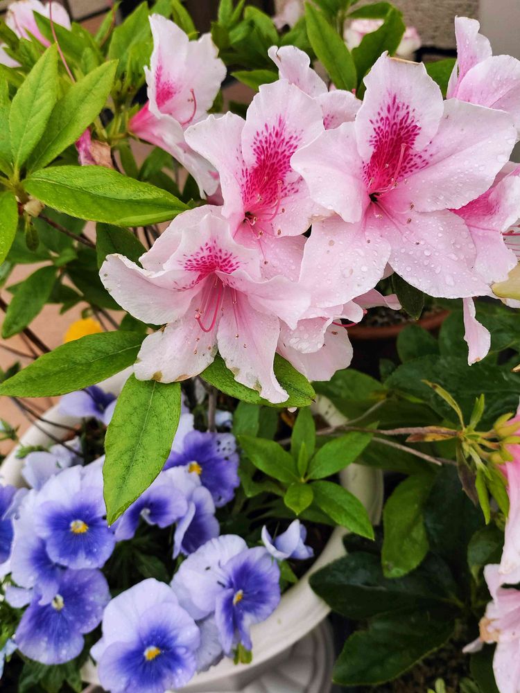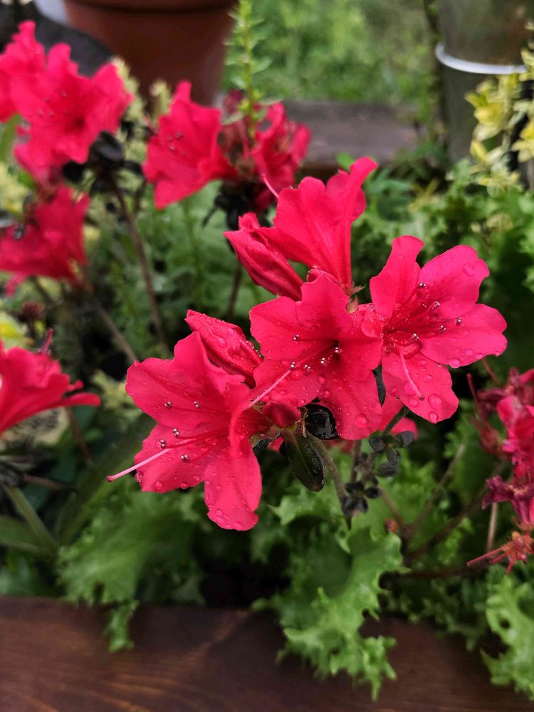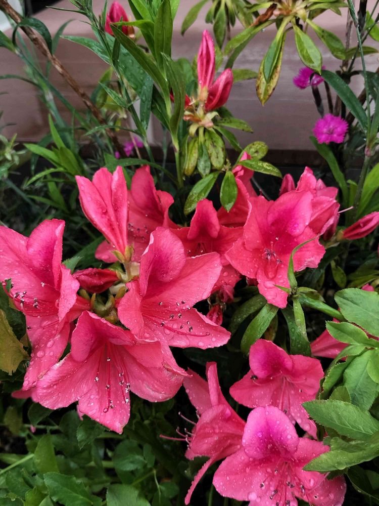 ヒラドツツジのピンクを最初に植えてとっても気に入り、桃、赤も増えました。基本寄せ植えに使っていますが、どんな花とも仲良くしてくれてとても偉いお嬢さん方です。