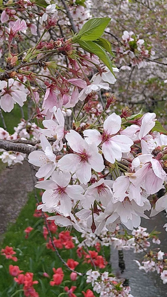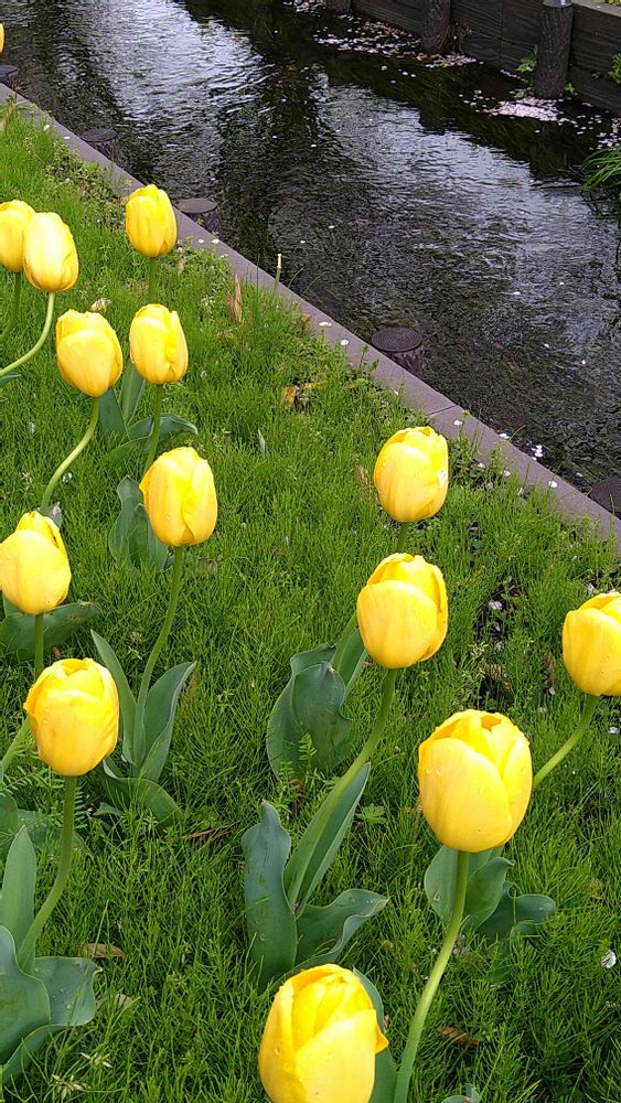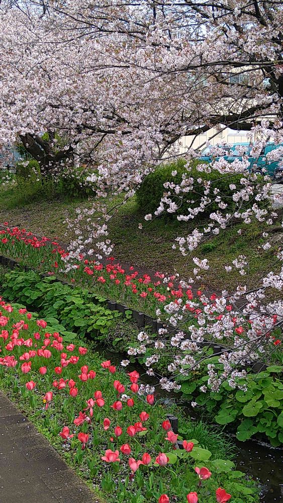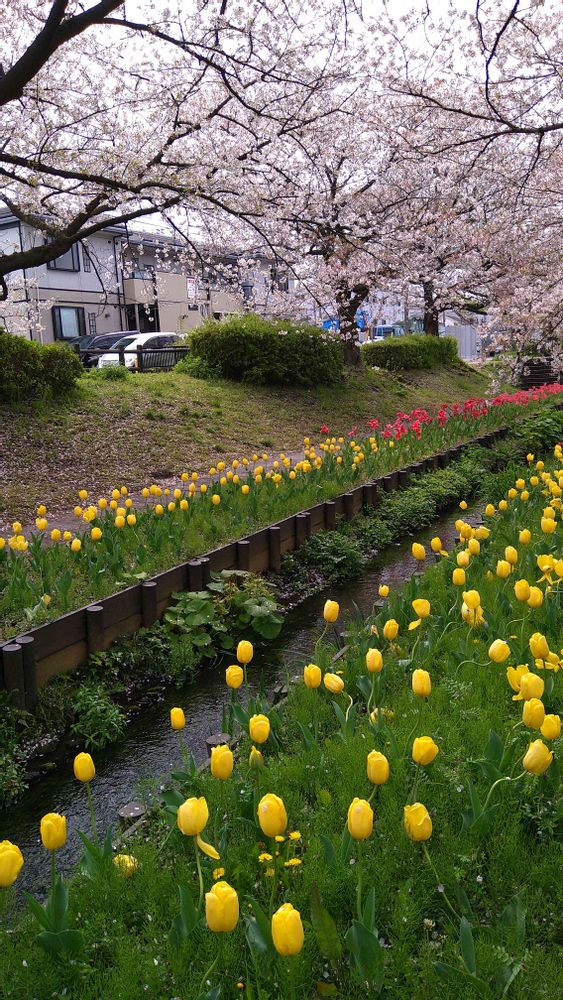せせらぎの両側にチューリップ🌷と桜🌸が咲き、🦆が流れに身を任せ、たまに足を動かして、