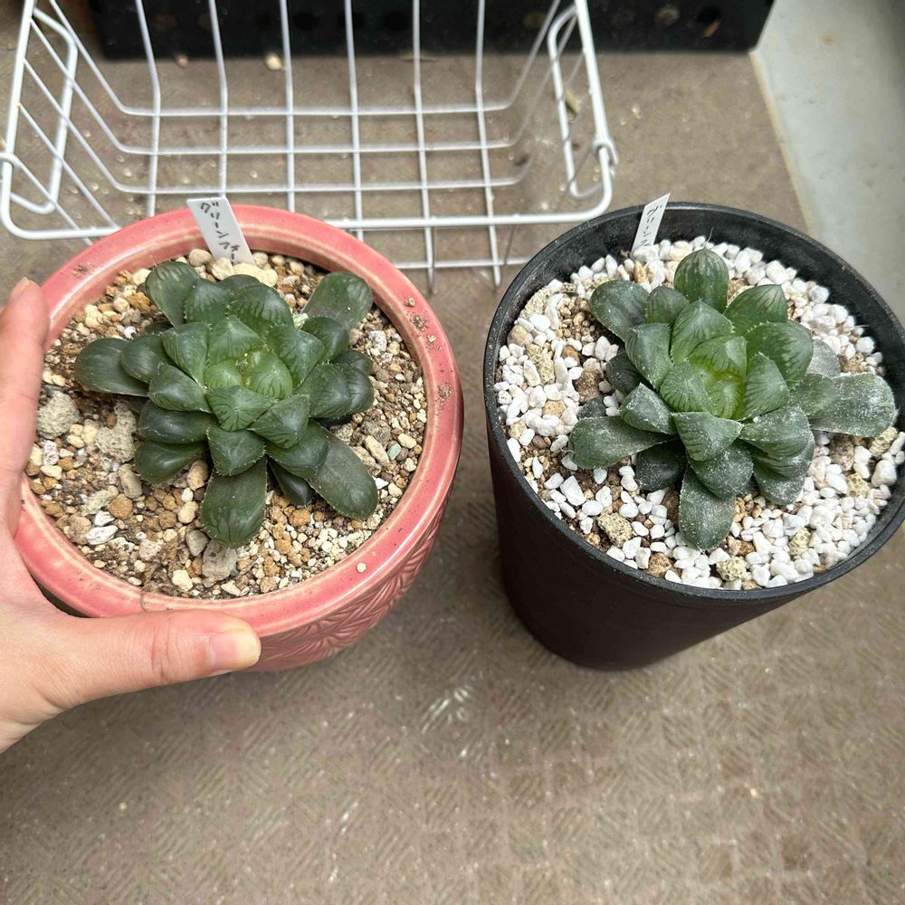 超大型グリーンフォームオブツーサの成長がすごい。お家に来てからどんどん大きくなって、大きな鉢に移したけど、それでもぎゅうぎゅうなので大きな鉢に一つずつ植えました。