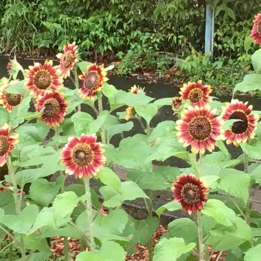 お出かけ先,赤いヒマワリ,花壇の投稿画像