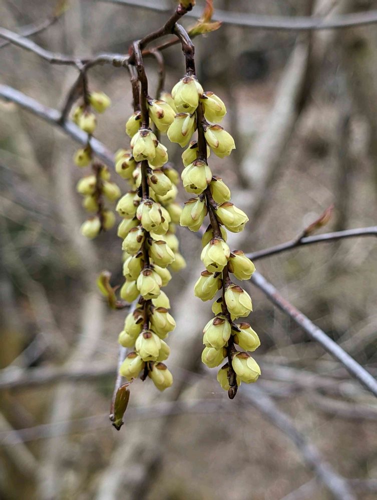 早春の林道歩きではよく目立つ黄花のすだれ。開花後、葉がしげる頃にはブドウのような緑の実ができます。今朝テレビで見ました。この実は昔お歯黒を染める時に使われたのだとか 2024.4.11 山県市