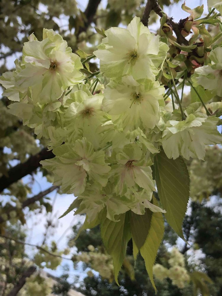 鬱金桜もウコン色(黄色)と言いますが、緑色に近いと思います。パッと見て、御衣黄と鬱金の違いがわかりませんでした。💚🤔🤭😊😄🌞