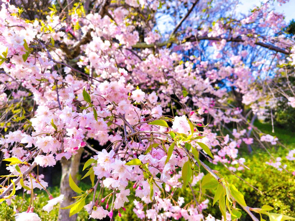 勝手に「十月桜」という品種だと思っていたのですが、今年はいつもに増して盛り盛りと花が咲いていて、どうやら八重桜のよう…。