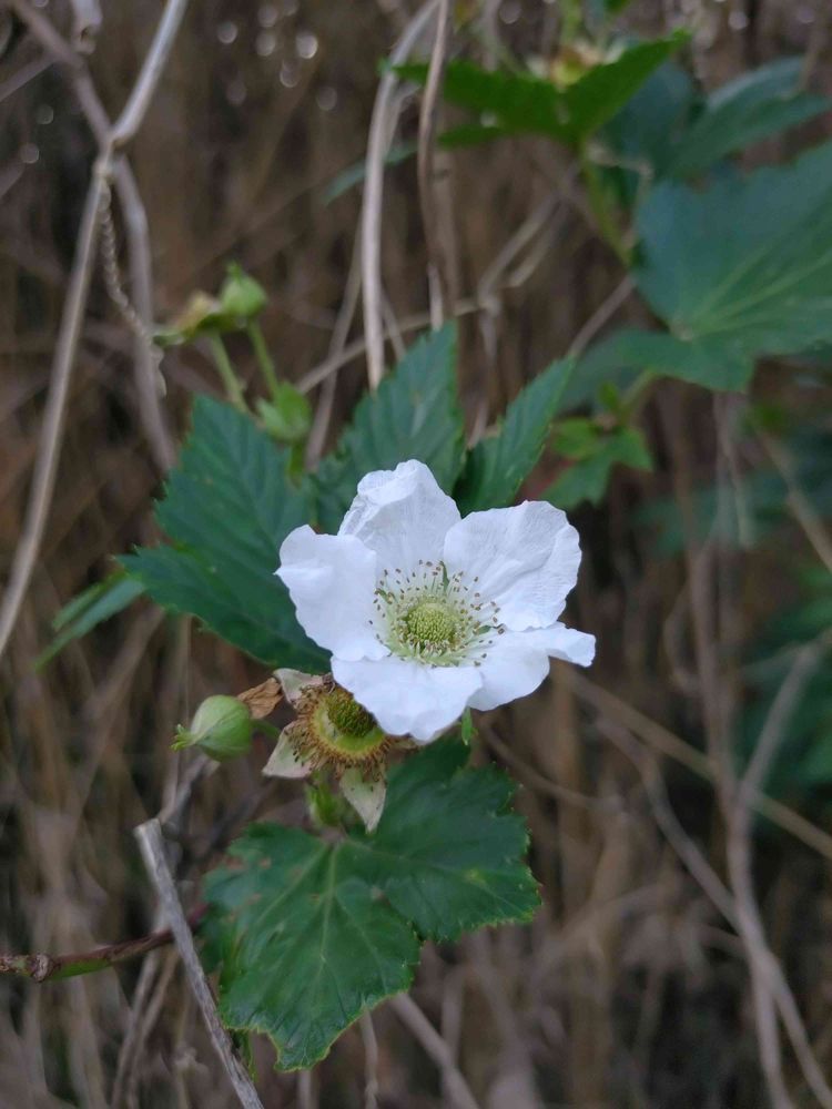 当初「クサイチゴ」としていましたが、葉の形など再度詳細を確認し、調べましたところ、「カジイチゴ」だと思われますので、カジイチゴに修正します。なお、クサイチゴは背丈が割と低く、葉は奇数羽状複葉で、フチにギザギザはないそうです。一方、カジイチゴはキイチゴの中でも大きく、木が2〜3mになることがあるそうです。葉は梶の木に似ていて、厚みと艶がある緑色の掌状で、フチはギザギザの鋸葉で、大きくなることが多いそうです。