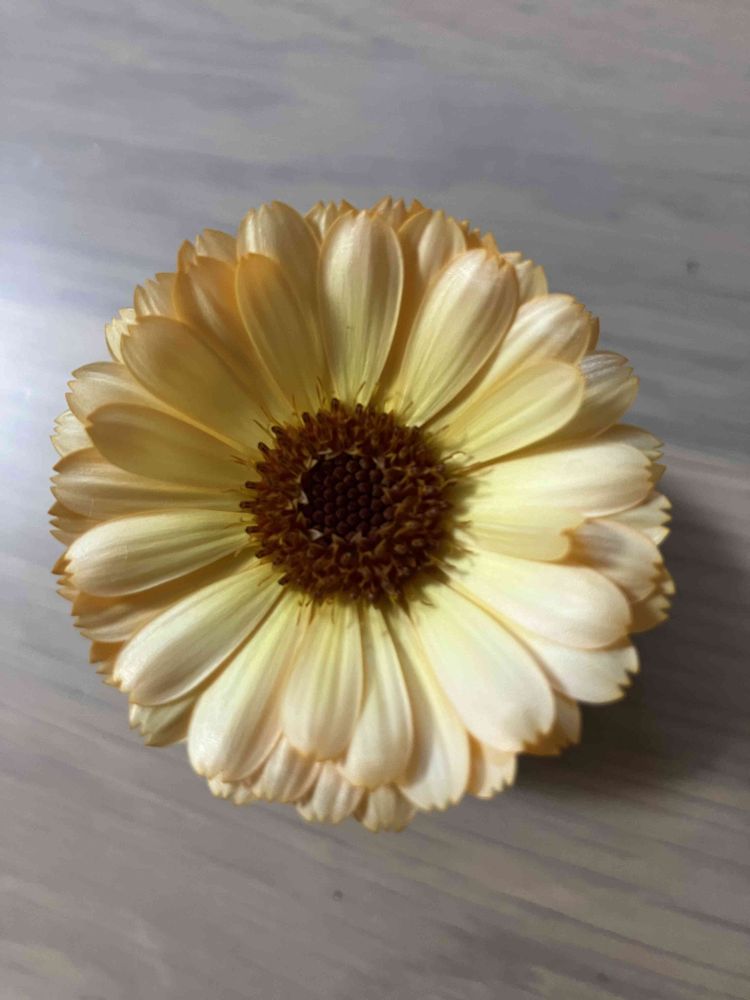 キンセンカです。品種がアプリコットだったかな〜?優しい色合いのキンセンカです。まん丸過ぎて、花瓶の上からパシャリ。