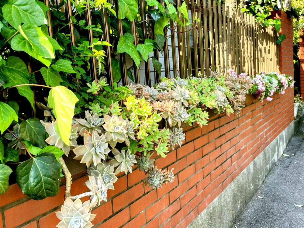 m&oさんの朝のウォーキングで,通り道のお宅の塀の上に,多肉植物がいっぱいの投稿画像