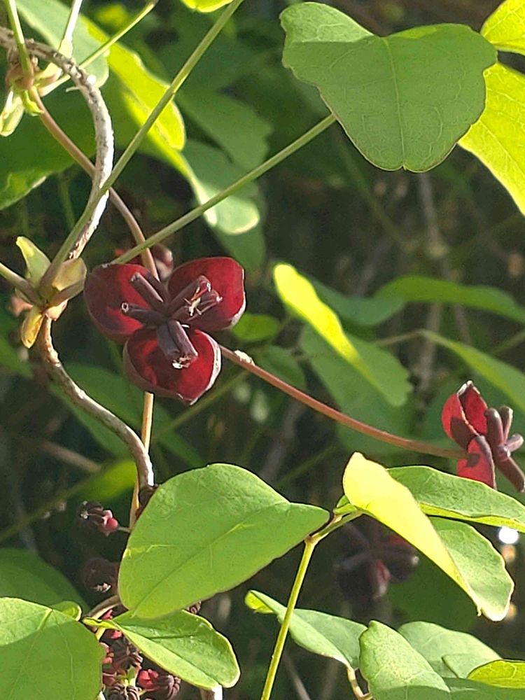 三つ葉あけびの花、光に透けて美しいですね、ガーネットのよう(持ってないけど❤️😁)
