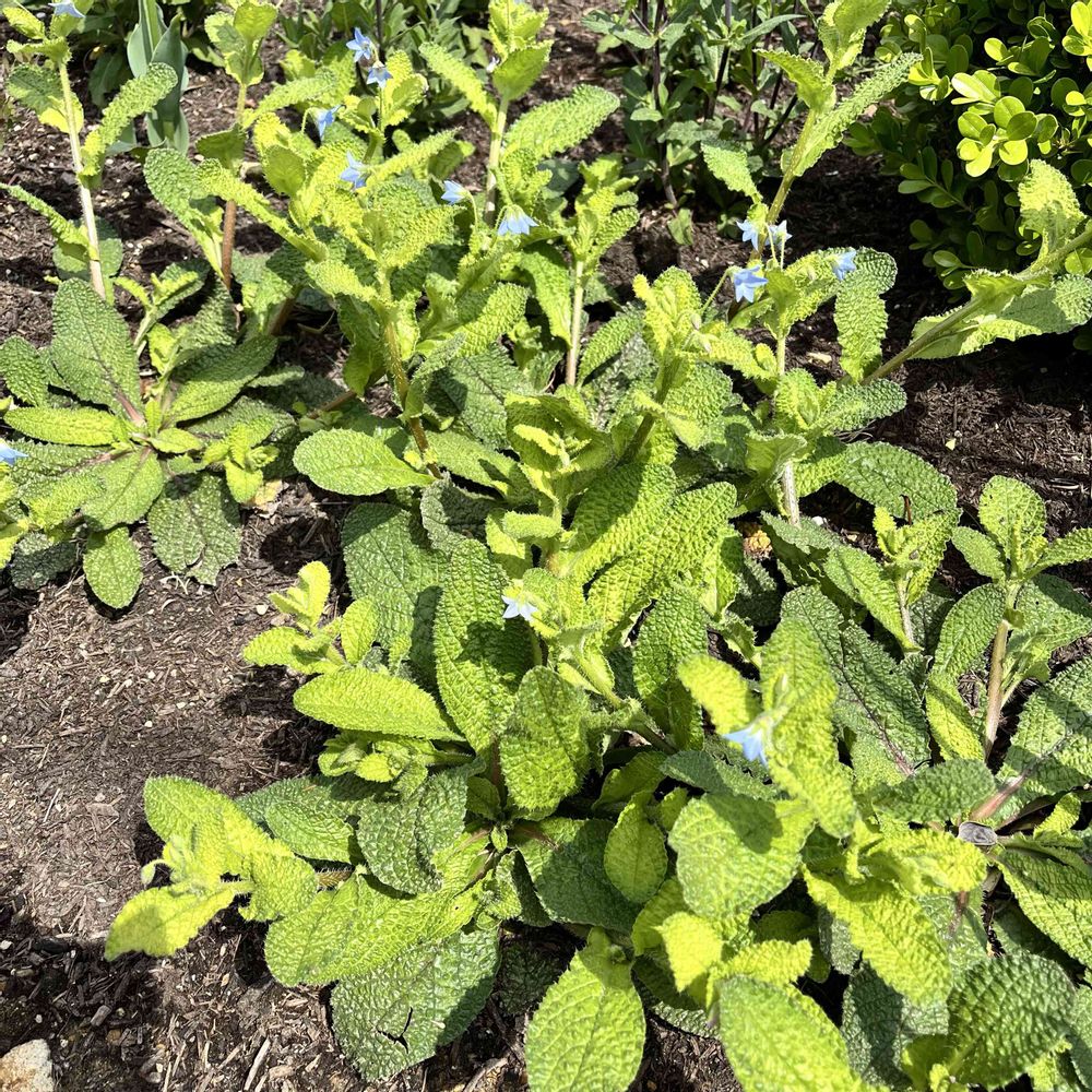 ほふく性で、株全体が堅い剛毛で覆われ、春から秋にボリジより小型で2cmほどの星形の薄いブルーの花を多数咲かせる。
