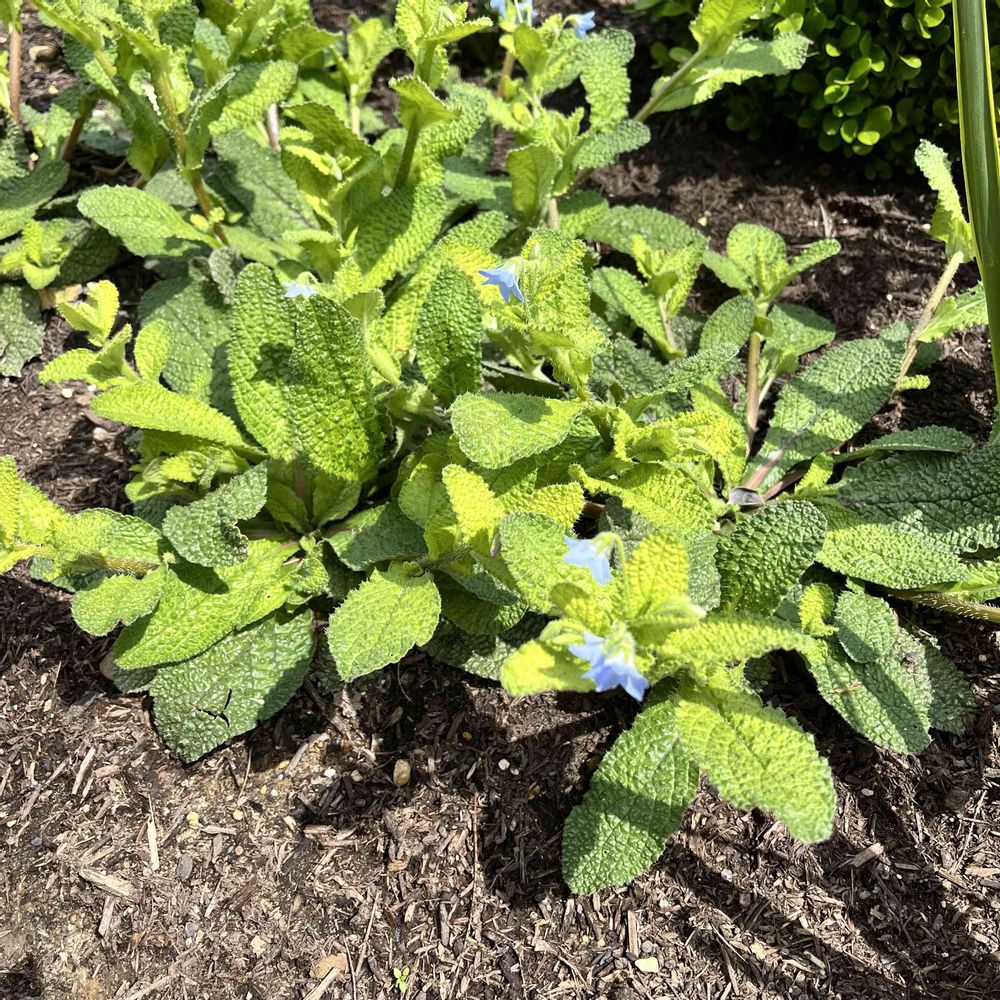 ライトグリーンの葉が庭を明るくする小さなライトブルーの花も可愛らしい💕