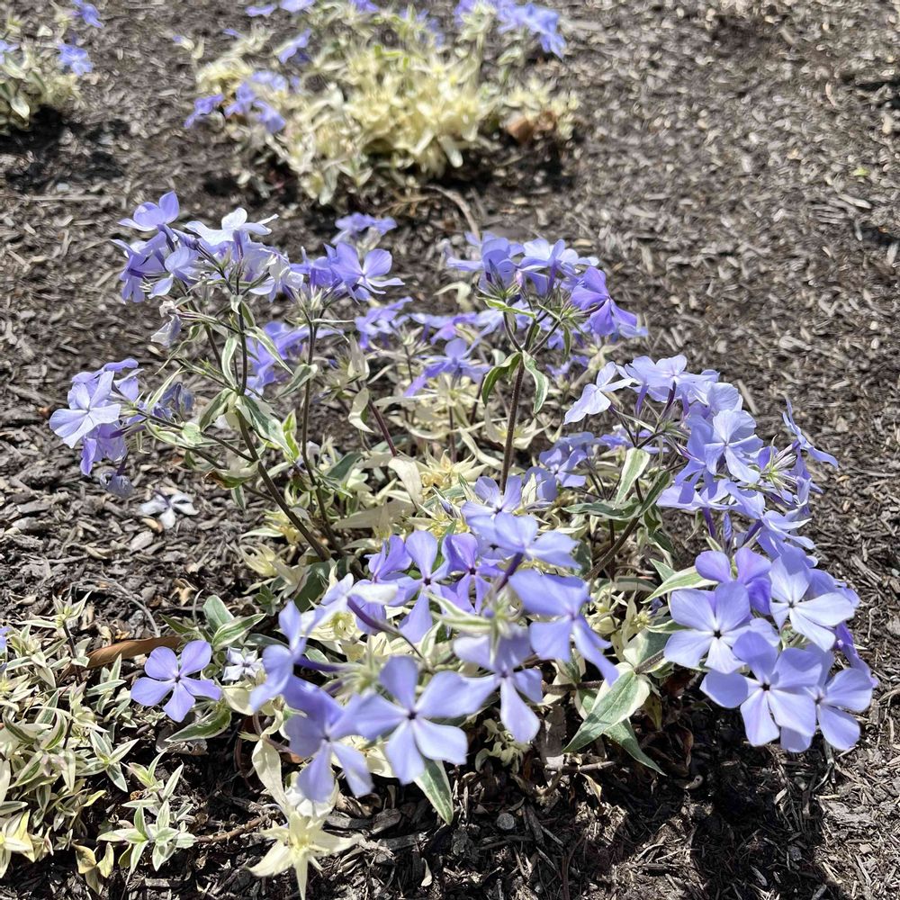 草姿になる這性のフロックス。 斑入り葉が花期以外もカラーリーフとして楽しめる。気温が低い時期はピンクを帯びて紅葉し一層美しい。花つきも良く、淡い青花と葉色の組み合わせがとてもきれい。芳香花