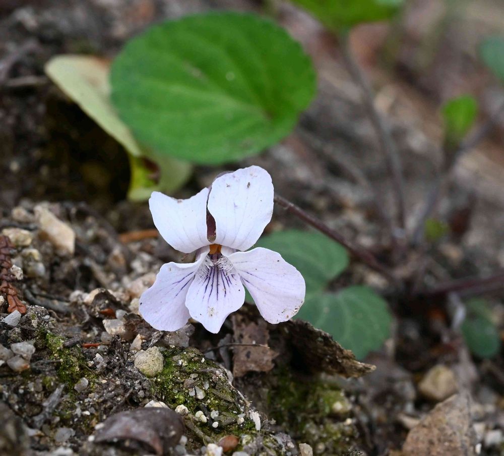ゲンジスミレとよく似ていますが葉には斑は入りません。エヒメアヤメと寒い時期に同じく大陸から来た植物とされます。