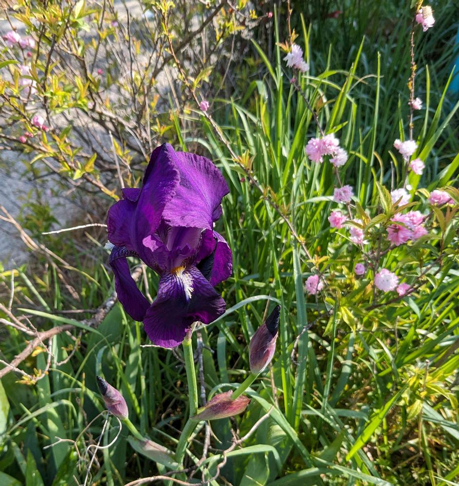 ①②物干し場の横にジャーマンアイリスが咲き出しました 庭桜と仲良く並んでいます