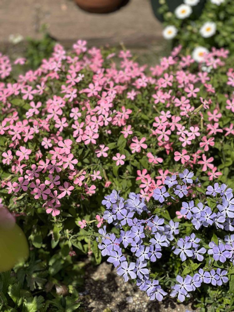 種まきのシレネと斑入りのツルハナシノブ…斑入りの葉っぱは消えてしまいましたがいい感じで咲いています