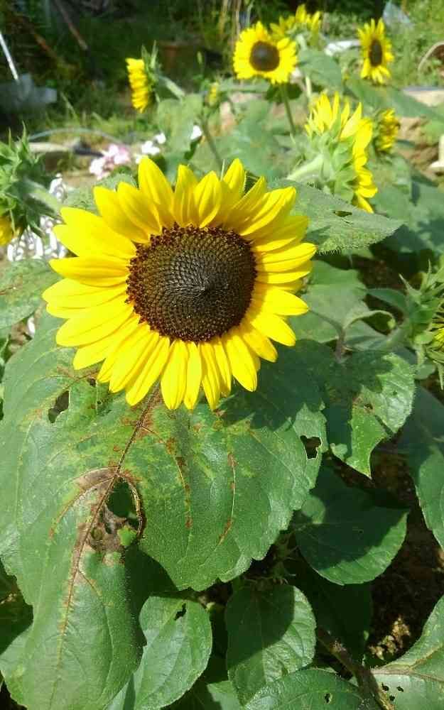 結構背丈の高いひまわりでも脇芽から、どんどん花咲いているの見かけますよ。