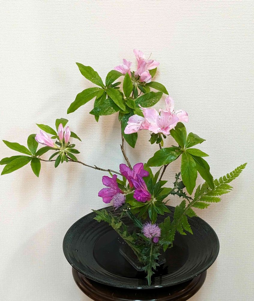 ゆったりとした大きな器に入ったツツジが美しいです。
