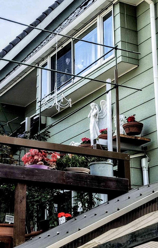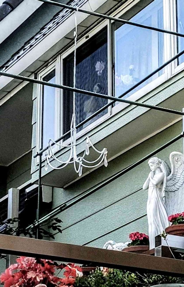 ①錆びて汚くなっていた吊り下げオブジェを、一旦、バラバラにして、錆びた鉄の代わりに、透明の飾り物を銅線で結びつけ、本体は吹付け白ペンキで塗装して、我が家の前の道を通行する人に見える位置に吊り下げた。