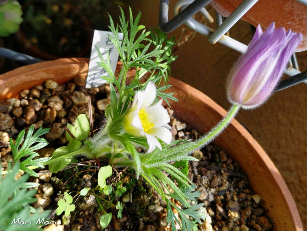 先日投稿したオキナグサ、白花の名札が付いてるのに紫色のお花が咲きましたが、その隣から白いお花が咲いてきました😅 紫花の種が入っていたみたいですね🥰
