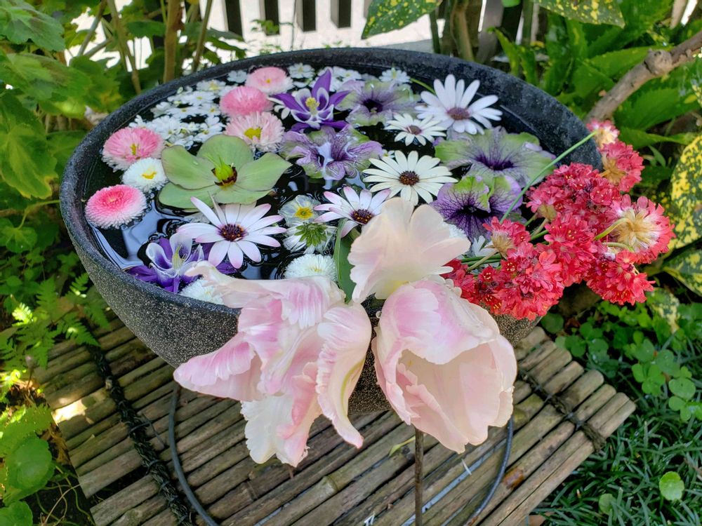 さん、茎がなくて花だけのものはこんな花手水がぴったりね!
