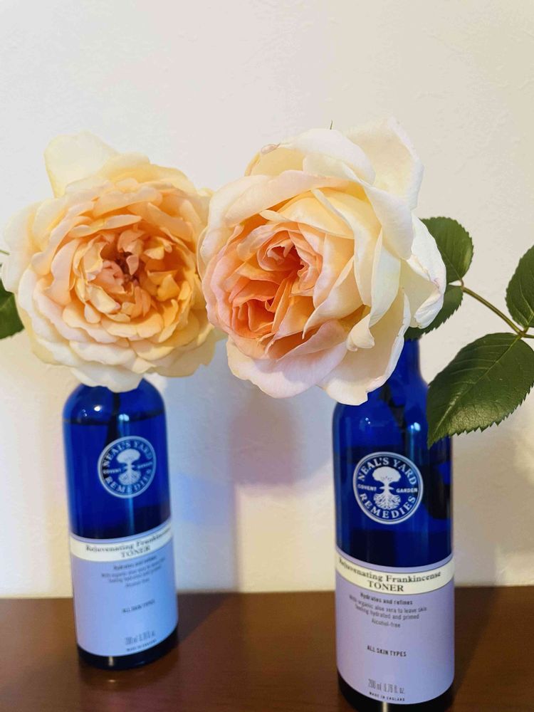 最近スキンケアで使ってるニールズヤード の空き瓶。挿してみたら安定感もありステム長めのポーちゃんがピッタリ🥰右の花、一輪ベージュピンクアプリコット、みたいなお色で咲きました😍